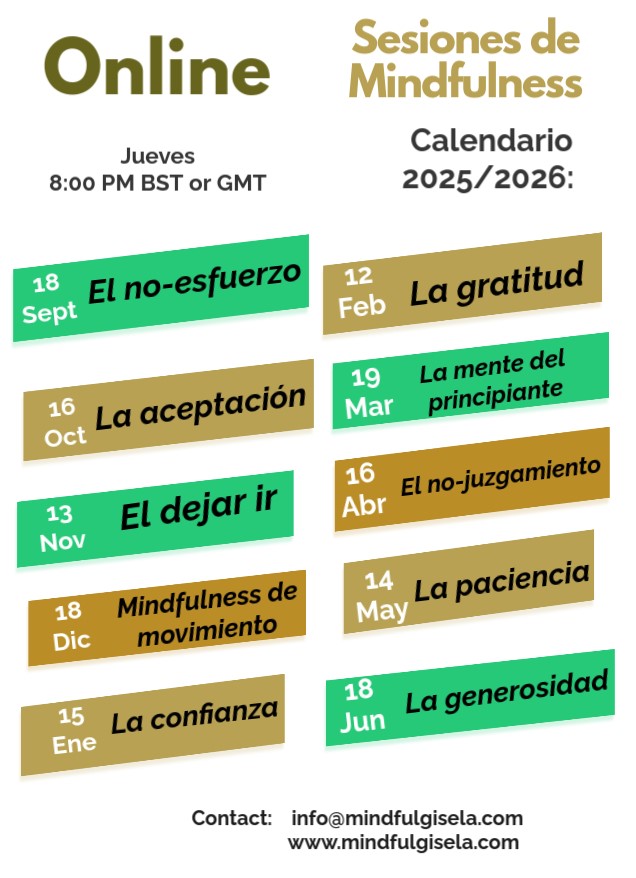 Cada una de estas sesiones se centra en un tema en particular, basado en una de las nueve "actitudes" de Mindfulness y Mindfulness de movimiento o mindfulness yoga. Durante las sesiones, practicamos ejercicios de Mindfulness, lectura de poemas, visualizaciones, discusiones, reflexiones, etc. en un ambiente amigable, seguro y de apoyo. Estas sesiones tienen muy buenas críticas y los participantes las disfrutan mucho.