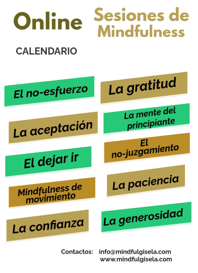 Cada una de estas sesiones se centra en un tema en particular, basado en una de las nueve "actitudes" de Mindfulness y Mindfulness de movimiento o mindfulness yoga. Durante las sesiones, practicamos ejercicios de Mindfulness, lectura de poemas, visualizaciones, discusiones, reflexiones, etc. en un ambiente amigable, seguro y de apoyo.