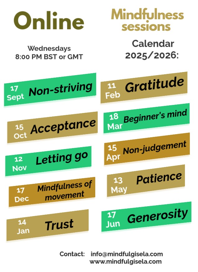 These sessions each focus on a particular topic, based on one of the nine 'attitudes' of Mindfulness and Mindfulness of Movement. During the sessions, we practice Mindfulness exercises, reading of poems, visualisations, group discussions, etc. in a friendly, safe and supportive environment. These sessions have very good reviews and the participants enjoy them dearly.